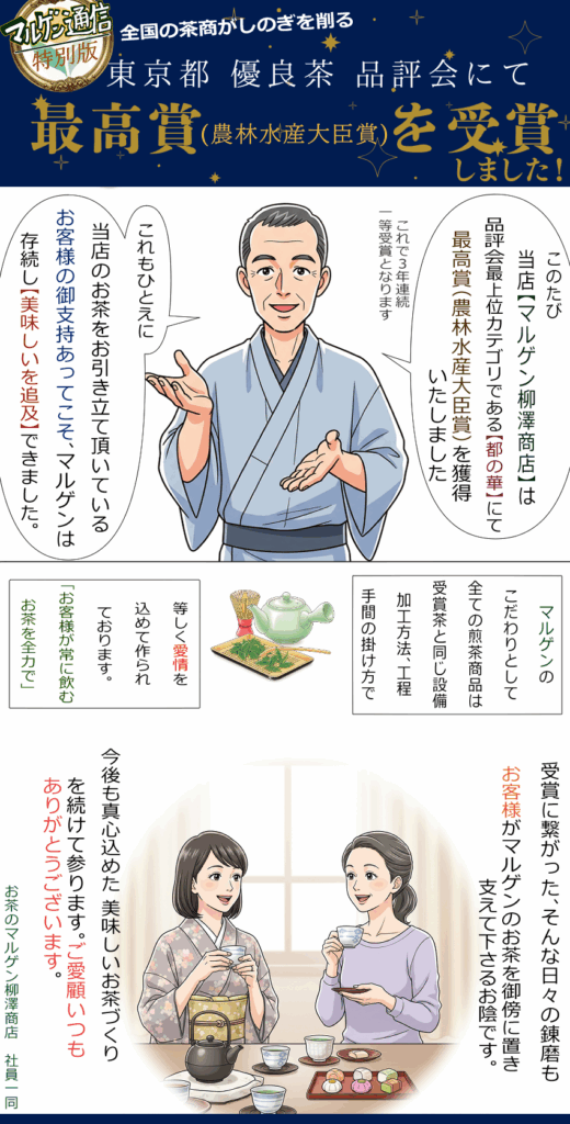 私たちの誇りは、最高峰の賞をいただけたことだけではありません。 「毎日飲んでも毎回美味しい」「やっぱりマルゲンさんのお茶が一番」 そう言ってくださったお客様の言葉こそが、何よりの宝物です。